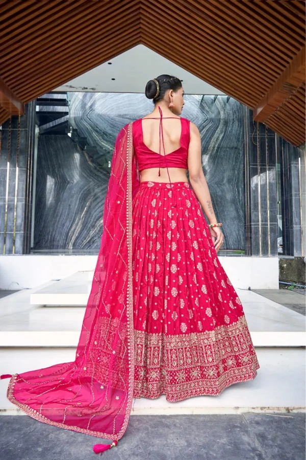 Fabric: Dola Silk | LEHENGA DETAILS: LEHENGA TYPE: (READY TO WEAR) LEHENGA FABRIC : JACQUARD DOLA SILK EMBELLISHMENT : EMBROIDERED WORK FLAIR : 4 MTR INNER : CREPE WITH 19”CAN-CAN LAYERED BLOUSE DETAILS: BLOUSE (READY TO WEAR) BLOUSE FABRIC : DOLA SILK EMBELLISHMENT : HAND WORK WITH EMBROIDERY WORK. DUPATTA DETAILS: DUPATTA FABRIC : ORGANZA EMBELLISHMENT : ALL OVER EMBROIDERED WORK. LENGTH: 2.40 MTR