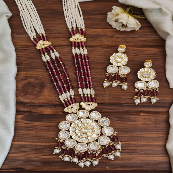 Kundan Stones High Gold Polish Clustered Pearl Designer Long Kundan Necklace Set
