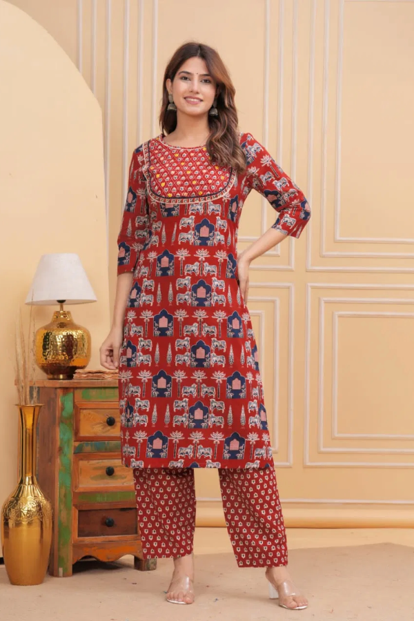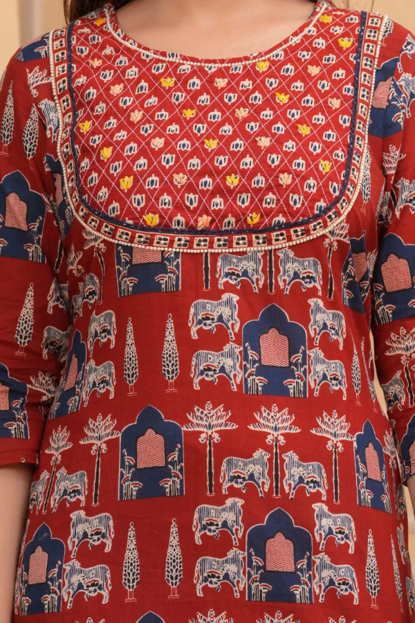 COTTON|COTTON KURTI AND BOTTOM DUPATTA SET WITH HANDWORK OF KANTHA AND MOTI WORK.