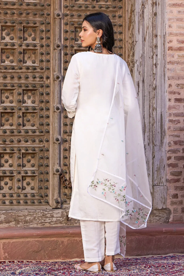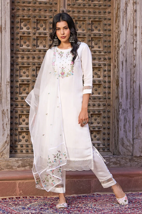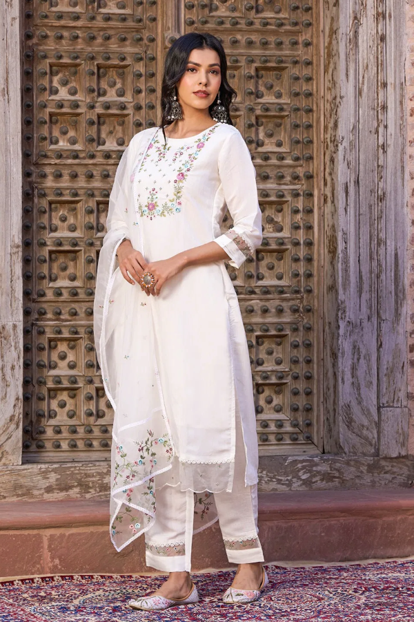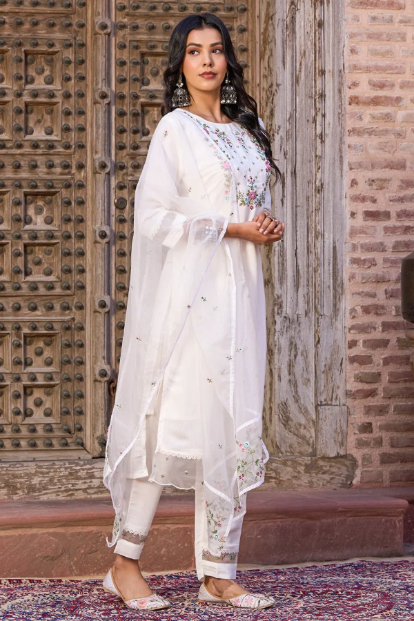 Fabric: chanderi | TOP FABRIC:VISCOSE CHANDERI | BOTTOM FABRIC : VISCOSE CHANDERI | DUPATTA : ORGANZA | TOP WORK: EMBROIDERY | BOTTOM WORK : PLAIN | WORK:EMBROIDERY | LENGTH:45 INCH